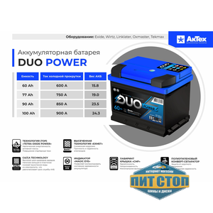 Аккумулятор АКТЕХ 90 Duo power 780A Asia п.п. Россия – представляет собой сочетание идеального исполнения и надежности, что поможет добавить весовое преимущество вашему автомобилю. Ежедневное использование даст вам возможность оценить непревзойденное качество и эталонные стандарты производства для максимально удобной эксплуатации. Аккумулятор подбирается под модель вашего автомобиля для надженой работы оборудования АКТЕХ – разрабатывает для вас варианты оптимально подходящие по цене и техническим характеристикам, предлагая лучшее, в соответствии с предоставляемыми требованиями. Duo power 780A Asia (Емкость — 90) имеет заявленную изготовителем емкость и устойчивость к перепадам температуры, из-за чего имеется возможность более длительного использования.