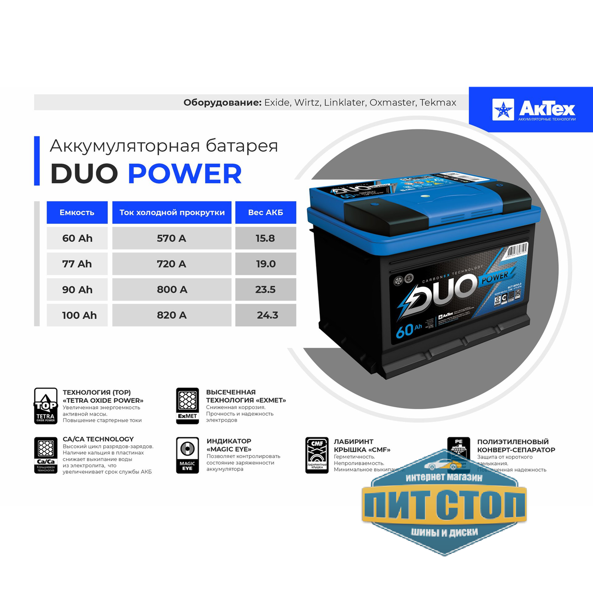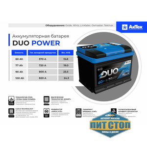 Аккумулятор АКТЕХ 50 Duo power 470A (кубик) п.п. Россия – представляет собой сочетание идеального исполнения и надежности, что поможет добавить весовое преимущество вашему автомобилю. Ежедневное использование даст вам возможность оценить непревзойденное качество и эталонные стандарты производства для максимально удобной эксплуатации. Аккумулятор подбирается под модель вашего автомобиля для надженой работы оборудования АКТЕХ – разрабатывает для вас варианты оптимально подходящие по цене и техническим характеристикам, предлагая лучшее, в соответствии с предоставляемыми требованиями. Duo power 470A (кубик) (Емкость — 50) имеет заявленную изготовителем емкость и устойчивость к перепадам температуры, из-за чего имеется возможность более длительного использования.