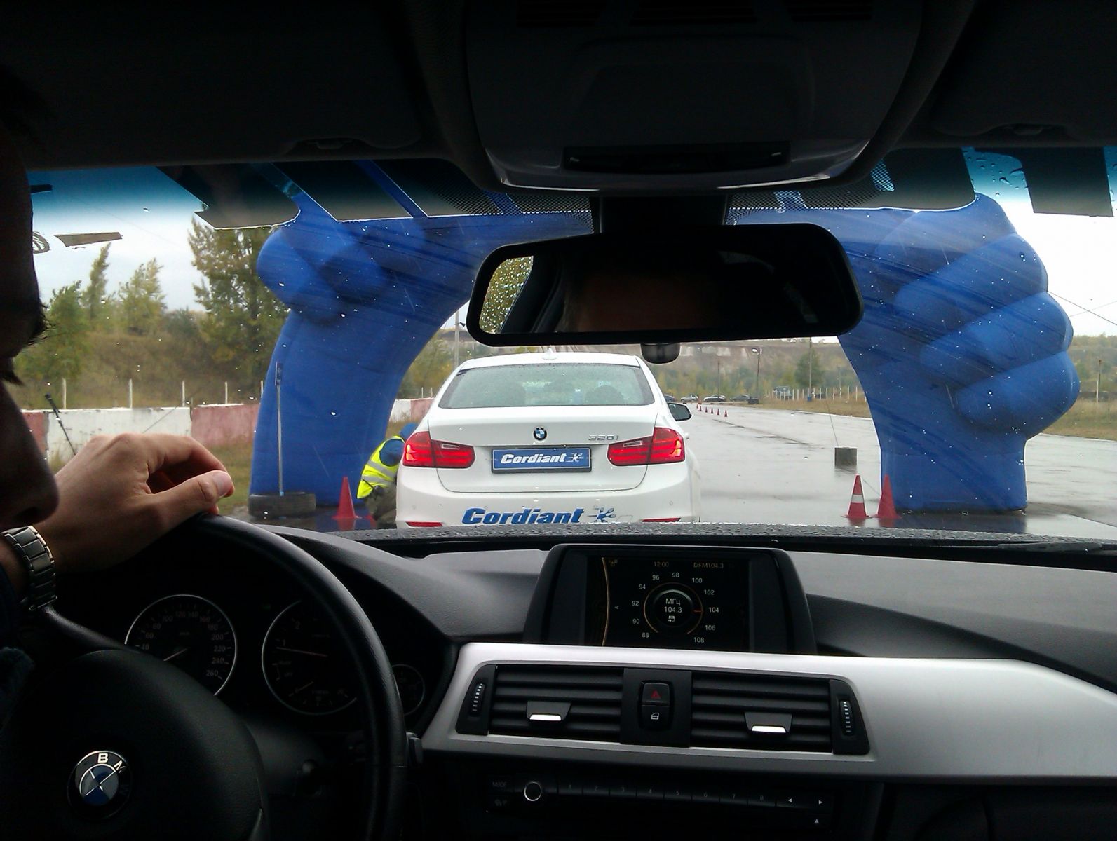 Для начала участникам предлагалось произвести переставку из одной колеи в другую с резким поворотом и торможением в конце на время. Затем произвести тест-драйв шин Cordiant на трассе со змейкой. Борьба была нешуточная. А драйвом заряжали новейшие автомобили bmw 3 серии.